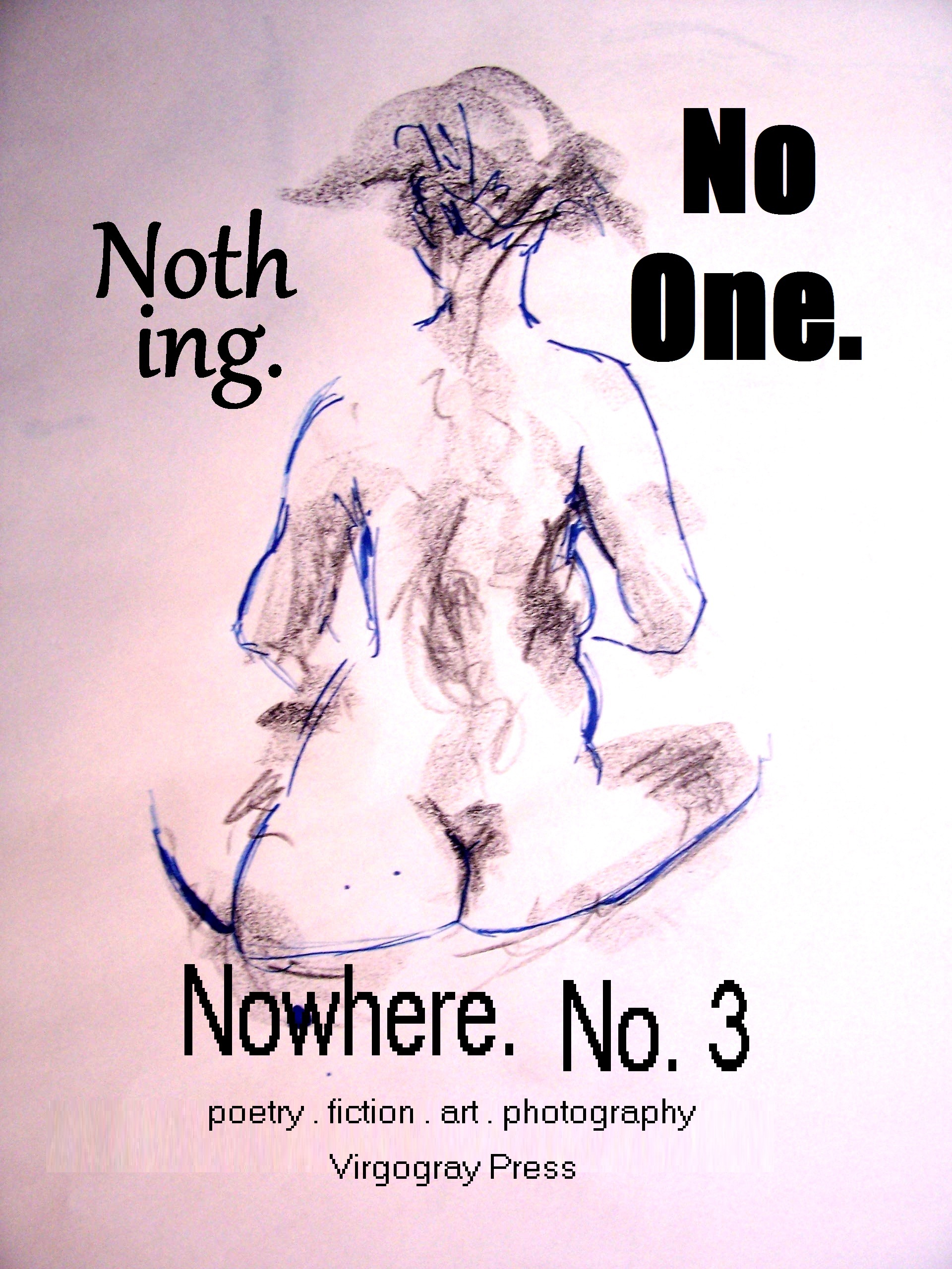 Today mark’s the release of our third installment of Nothing. No One. Nowhere. an underground lit rag Virgogray so ventured to publish starting in 2011. Finally, in its 3rd issue, Nothing. No One. Nowhere. features new and known poets and writers to the indie lit scene, and we are proud to host them. This issue also features an interview and art spread by artist Justin Jackley whose work has appeared Virgogray Press titles like 2009’s Broke Nuptial Minds by A.J. Kaufmann and Peter Magliocco’s Nude Poetry Garage Sale (2010). While there is an absent reviews section (to return in the fourth issue), the latest NNN is brimming w/ poetry, fiction and art to satisfy every sense.