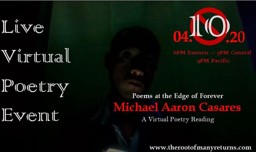 Join Michael Aaron Casares for a live virtual event on Friday, April 10, 2020. Michael presents, “Poems at the Edge of Forever.” Select verse from hos upcoming collection, The Vanishing Poet, due out April 21st, 2020. There will be a giveaway, an unknown quantity of signed copies of the vanishing poets, and other items. At any juncture, Michael looks forward to reading and meeting any participants or listeners who may join in. A brief Q&A and chat session will be available at the conclusion of the reading.
